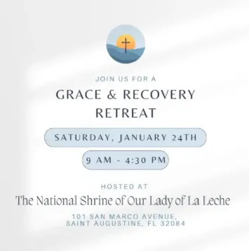 The Grace and Recovery retreat(s) will include witness talks, scriptural reflection and meditation, small group discussion, and a review of the 12 steps of recovery. Catholic Mass and confession are optional. All ages are welcome.